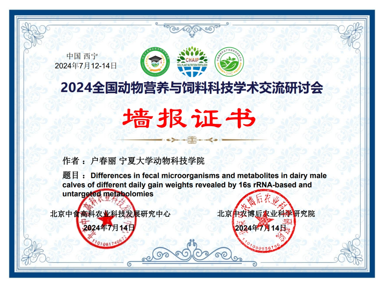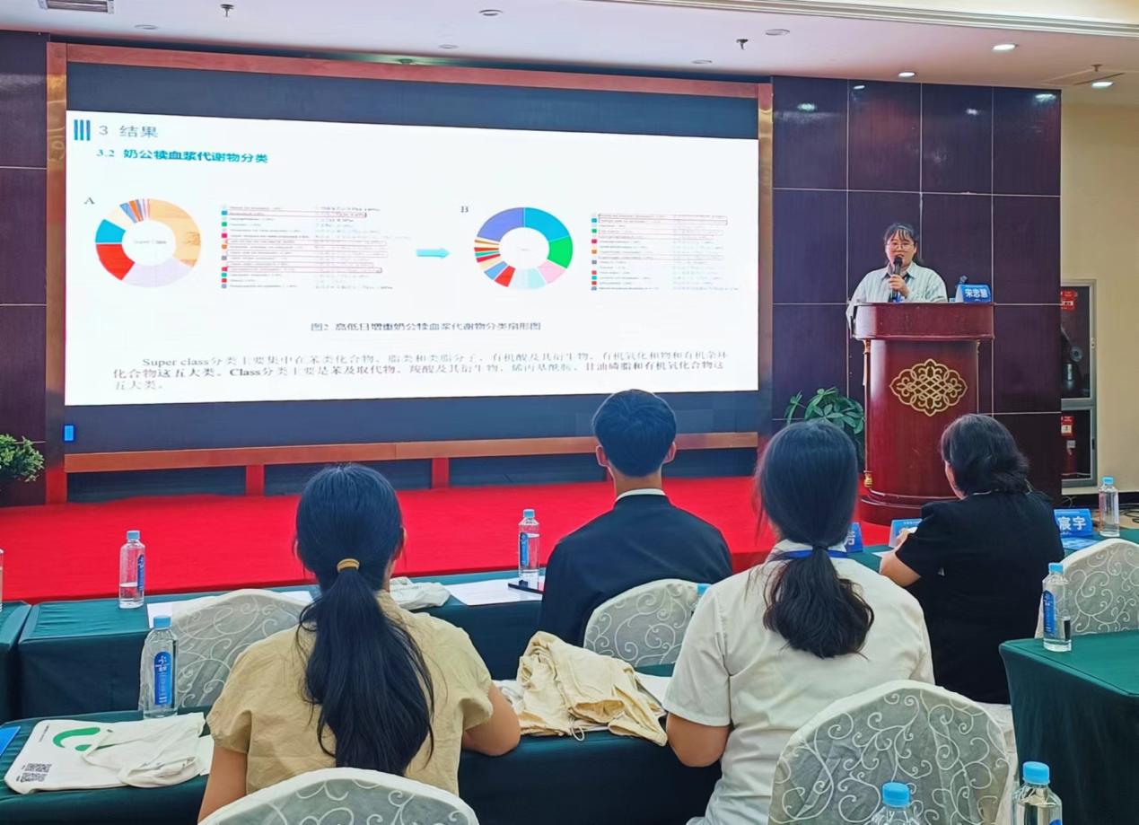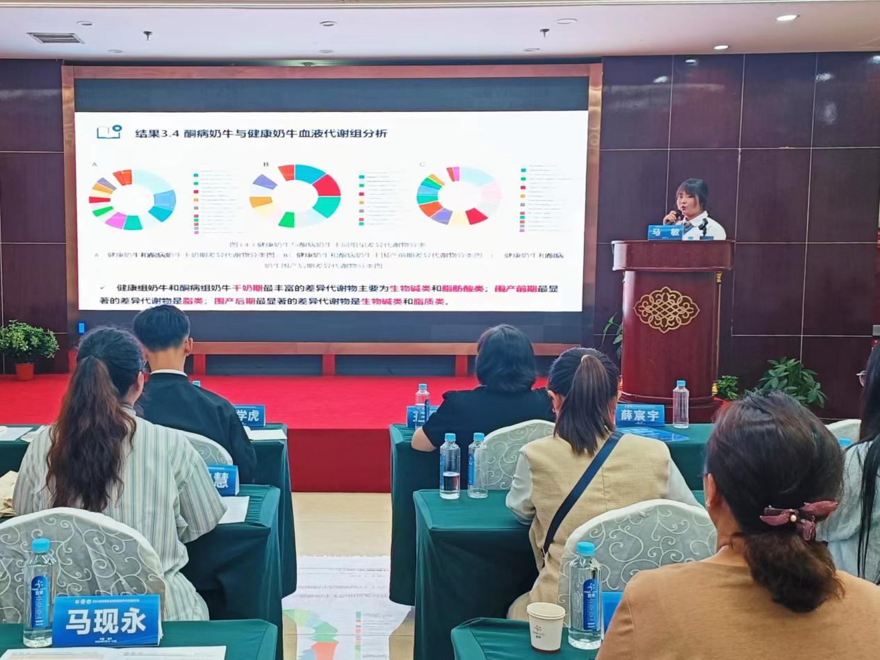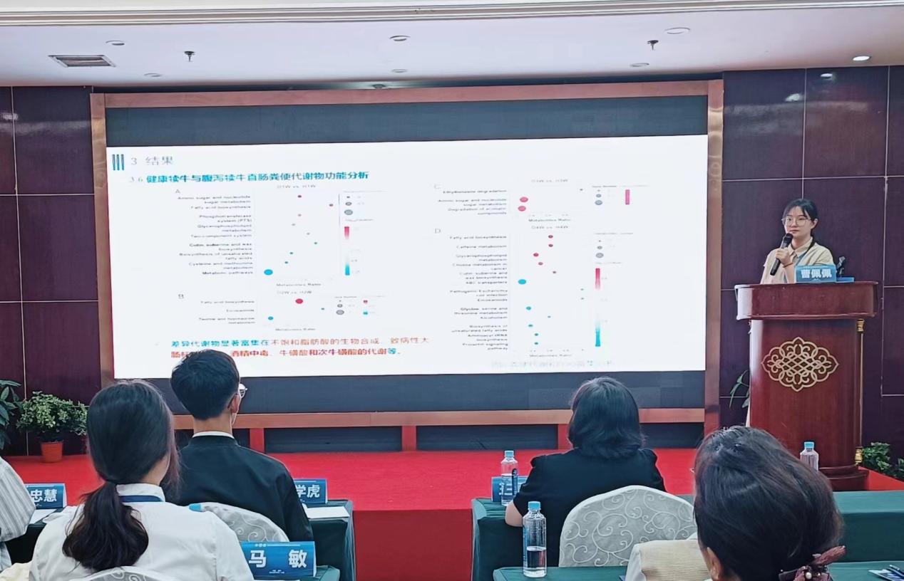 马燕芬研究员指导的博士研究生马学虎以《EGCG缓解氧化损伤奶牛乳腺上皮细胞的研究》为题作口头报告、硕士研究生曹佩佩以《基于16s rDNA和代谢组学揭示调控犊牛腹泻的关键微生物和关键代谢物》为题作口头报告、硕士研究生宋忠慧以《高低日增重奶公犊血浆差异代谢物分析研究》为题作口头报告、硕士研究生马敏以《基于代谢组学探究围产期奶牛血液代谢物及主要代谢通路分析》为题作口头报告、博士研究生户春丽以《Differences in fecal microorganisms and metabolites in dairy male calves of different daily gain weights revealed by 16s rRNA-based and untargeted metabolomies》为题作墙报展示。通过参加本次学术讨论会,不仅加强了团队师生的学习交流能力,又对当前我国动物营养与饲料科学领域热点有了更为深入的了解。为ag百家乐