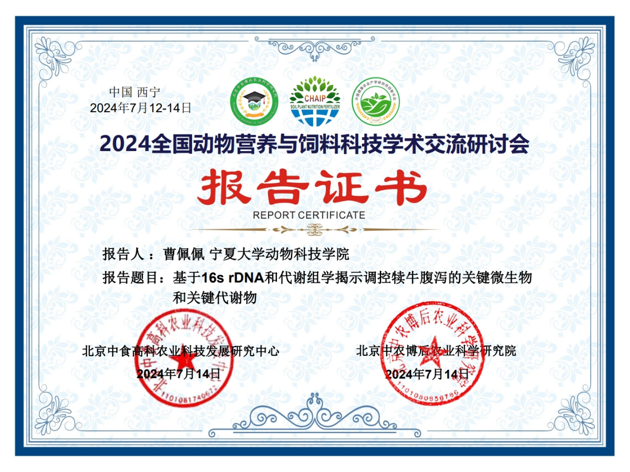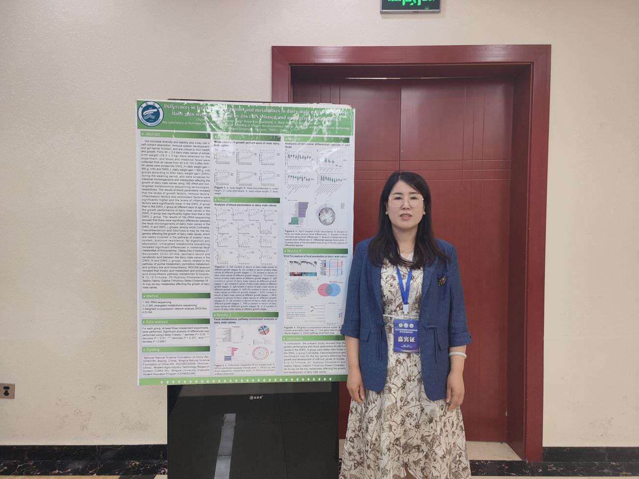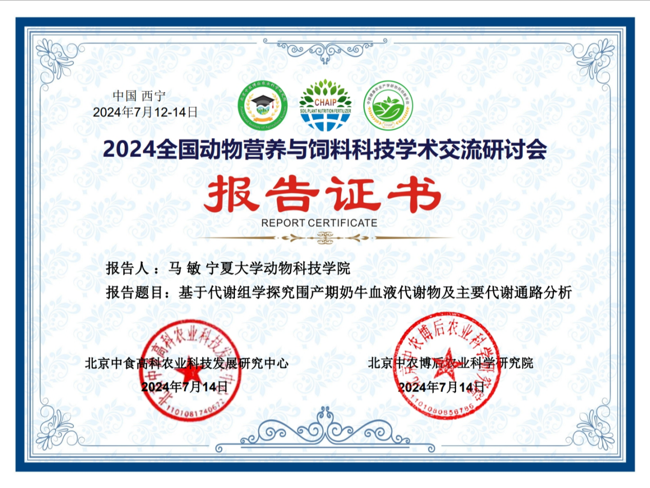 马燕芬研究员指导的博士研究生马学虎以《EGCG缓解氧化损伤奶牛乳腺上皮细胞的研究》为题作口头报告、硕士研究生曹佩佩以《基于16s rDNA和代谢组学揭示调控犊牛腹泻的关键微生物和关键代谢物》为题作口头报告、硕士研究生宋忠慧以《高低日增重奶公犊血浆差异代谢物分析研究》为题作口头报告、硕士研究生马敏以《基于代谢组学探究围产期奶牛血液代谢物及主要代谢通路分析》为题作口头报告、博士研究生户春丽以《Differences in fecal microorganisms and metabolites in dairy male calves of different daily gain weights revealed by 16s rRNA-based and untargeted metabolomies》为题作墙报展示。通过参加本次学术讨论会,不仅加强了团队师生的学习交流能力,又对当前我国动物营养与饲料科学领域热点有了更为深入的了解。为ag百家乐