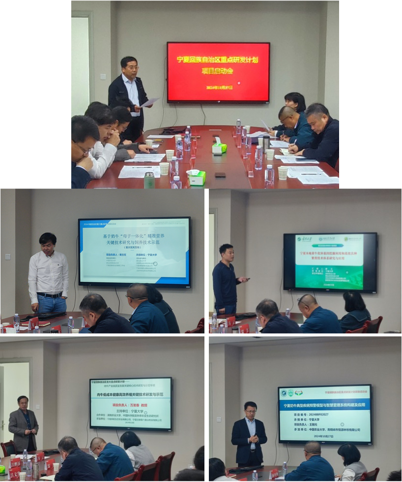主持的2024年宁夏回族自治区重点研发计划“基于奶牛“母子一体化”精准营养关键技术研究与饲养技术示范(重大)”、“宁夏本地黄牛优异基因挖掘利用和高效良种繁育技术体系研究与应用(重大)”、“肉牛低成本健康高效养殖关键技术研发与示范(重大)”和“宁夏奶牛典型疾病预警模型与智慧管理系统构建及应用(重点)”四个项目联合启动会在ag百家乐