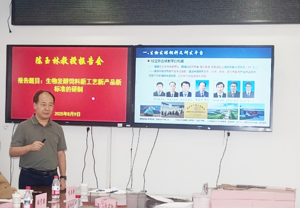 会上,陈玉林教授以当前家畜营养方向从精准营养调控向安全养殖-家畜肠道健康的转变为例,提出利用微生物手段服务畜牧行业。一方面响应国家减抗禁抗的相关政策,另一方面实现精准高效安全的核心营养调控技术。随后分别从生物发酵饲料及研发平台、生物发酵饲料的新工艺、生物发酵饲料的新产品、生物发酵饲料的新标准、人才校企合作培养成效等五个方面,介绍团队近年来利用微生物科技创新在非常规微生物饲料研发方面的工作进展和科研成果。