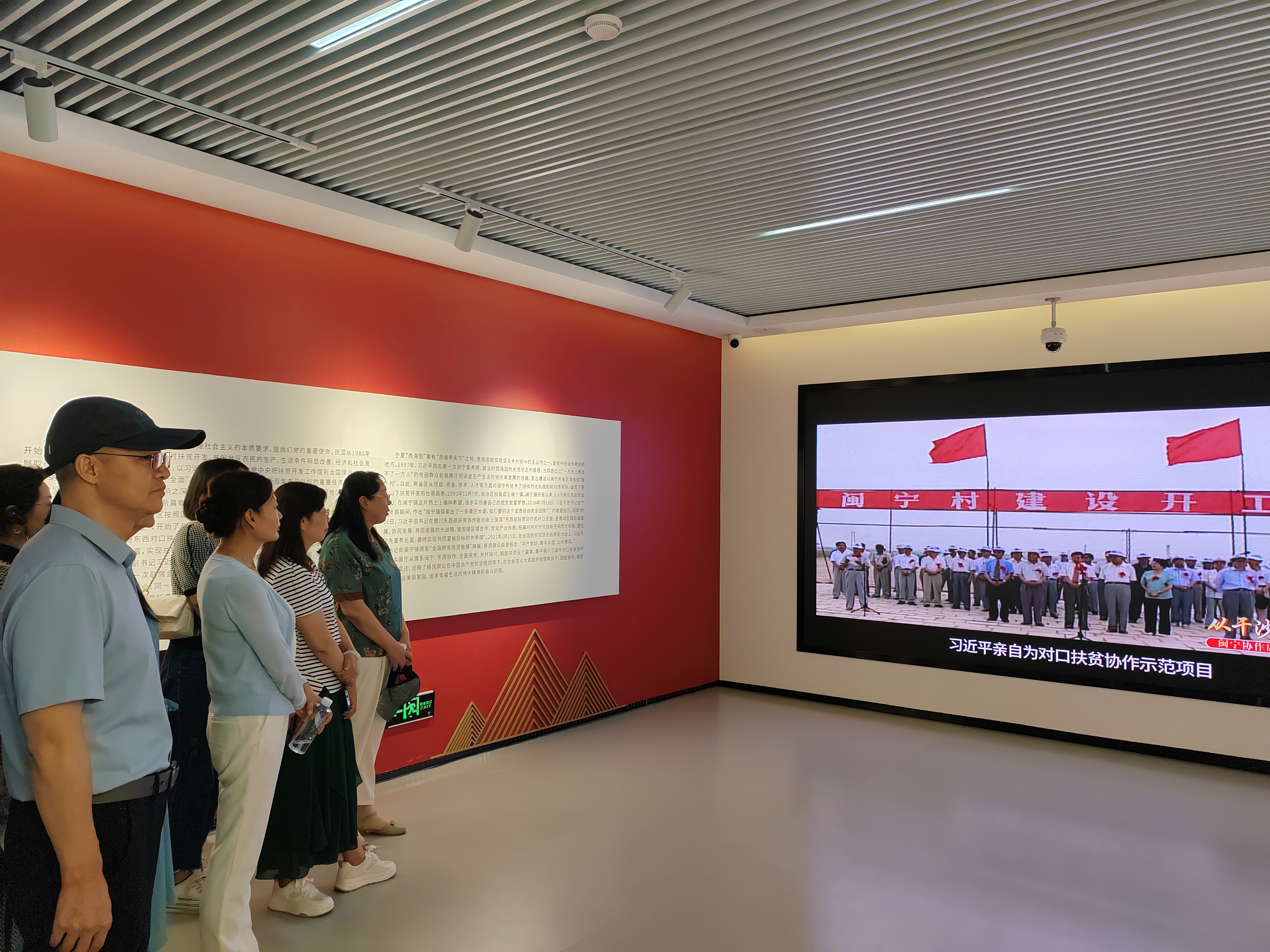参观过程中,全体党员同志学习了闽宁镇的发展历史,了解了这个当年的扶贫移民区历时20多年从一个荒芜之地发展成为常住居民6万余人的特色旅游小镇的全过程。20多年来,两省区干部群众接续奋斗、久久为功,一任接着一任干,引企业、育产业、惠民生,扶贫又扶志,引才亦引智,用智慧和汗水创造了东西部扶贫协作的“闽宁模式”,8000多人的闽宁村已经成长为6万多人的闽宁镇,形成了特色种植、特色养殖、文化旅游、设施农业、商贸物流等一批特色优势产业,昔日天上无飞鸟、地下不长草、十里无人烟、风吹沙粒跑的“干沙滩”,变成了现在绿树成荫、良田万顷、经济繁荣、百姓富裕的“金沙滩”。